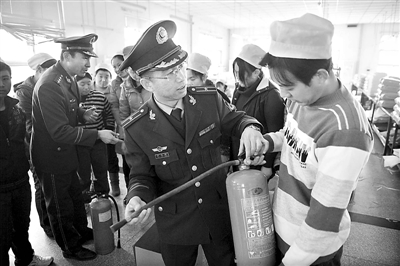2月22日,红岛公安边防派出所警官高志宏(前左)在指导通惠服装厂“消防安全员”刘海涛如何使用灭火器。近日,青岛红岛公安边防派出所对辖区厂企开展消防安全拉网检查,并着重对工厂节后新招收的务工人员进行了基本的消防安全教育和技能培训,增强其“安全打工”的意识,提高了企业员工抵御火险灾害的能力。 新华社记者 李紫恒 摄