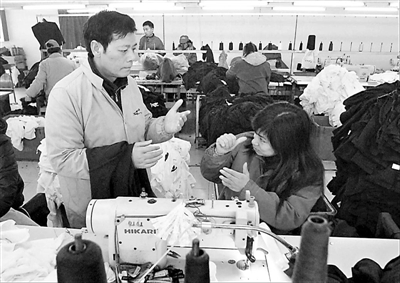 2月21日,在江西九江市荣达制衣厂,残疾人刘芳芳(右一)正在工作岗位上用手语与管理人员进行沟通。近期,江西九江市部分企业为有劳动能力的残疾人提供熨烫、车工、整理、搬运、清洁等就业岗位,解决用工需求,并为周边地区的有劳动能力的残疾人士提供更多就业机会。胡国林 摄