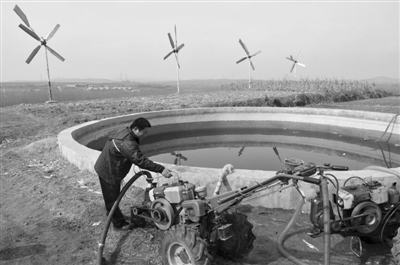2月19日,山东省日照市东港区西湖镇大花崖村,村民在利用风力提水设施浇灌麦田。近几年,山东省日照市在山区乡村安装了数百台风力提水机,解决了山区农田的灌溉难题。