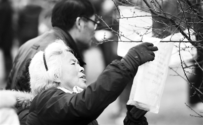 2月26日,一位老人在相亲会上查看相亲者资料。当日,武汉东湖梅园举办“以梅为媒”万人相亲活动,相亲会上却难觅年轻人的踪影,大多是家中的老人代替子女前来相亲。新华社记者 郝同前 摄