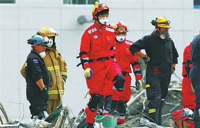 图为中国救援队队员在掩埋了多名中国留学生的坎特伯雷电视大楼废墟上。除废墟清理工作外,还利用生命探测设备搜寻生命痕迹。吉平 供图