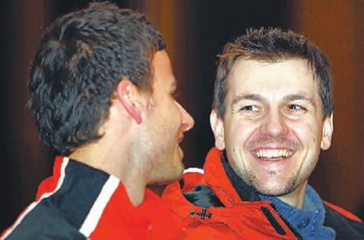2月28日,德国选手波尔(右)在2011年亚欧乒乓球对抗赛中国赛发布会上。新华社记者 廖宇杰 摄