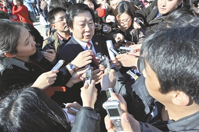 图为全国政协委员、天津侨联副主席潘庆林3月3日在全国政协十一届四次会议开幕前对于高房价问题发表了自己的看法。本报记者 张宪 摄