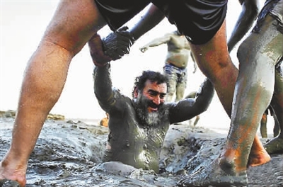 以色列旅游部近日赞助24名去年被困地下69天后奇迹获救的智利矿工与其妻子儿女前往基督教圣地进行为期8天的旅游。图为矿工们在死海享受“黑泥浴”。阿健 供图