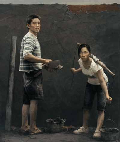 获得全国美展金奖的油画《小夫妻》,从最常见的角度,最普通的形象,画出了一个年轻人追求幸福,企盼明天更美好的时代背景。两个正在自己动手筑砌小家的年轻人,对未来充满希望、略带青涩的眼神,朴素平常的衣着和简单的劳作,构成了画面全部的可视元素。但是作者在构图和色彩上却别具匠心,具有张力的涨满构图,仅在上方留有一线透气,仍可预示着空间的无限,对未来仿佛寄寓着春天般的希望;在糊满水泥的暗灰色单调背景色彩上,作者有意留出一块尚未填补的暖色,一则通过冷暖对比可活跃画面,又可在单调中求得视觉变化,也暗示努力仅差一步;人物造型的准确把握,更显出作者深厚的绘画功底,笔触准确灵动,扎实且不呆板,细部刻画精准,整体勾勒轻松随意,人物色彩不仅明暗对比强烈,更在冷暖对比上发挥出油画的最大优势,以亮冷暗暖将主体人物凸于画面最前。《小夫妻》虽是小题材,但通过人物造型刻画,构图的张力,色彩的对比,都突出了“春天的希望”这个大创意的给力主题。(法明)