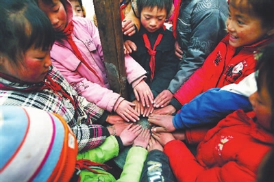 ① 甘肃渭源县一所学校的一年级小学生在课间休息时围着火炉取暖。