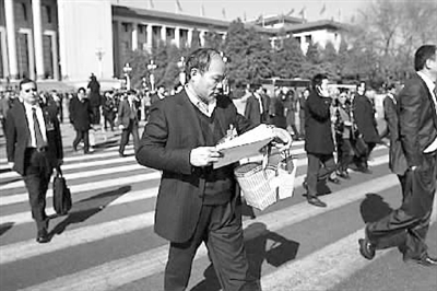 3月10日,十一届全国人大四次会议的全体代表会议结束后,代表们走出人民大会堂。别的代表都用手提包装着会议材料,只有全国人大代表、浙江永嘉绿色环保志愿者协会会长陈飞拎着用竹子编织的菜篮子。