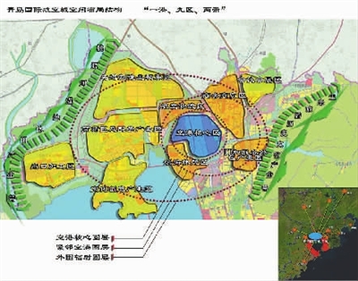 据他介绍,城阳打造“青岛国际航空城”,就是要进一步依托空港优势走出一条具有城阳特色的经济高端化、产业集群化、城乡一体化、生态宜居化的发展新路子。“一港”——空港核心区,努力打造成为现代化、生态化的东北亚航空枢纽港。“九区”—— 航空物流区,着力打造环黄渤海航空物流中心。高新区配套产业区,重点发展集成电路、生物医药、精密机械等产业。会议会展区,加快建设成为青岛市国际商务会议、会展中心。IT和服务外包产业区,重点发展计算机应用系统制造、软件产品开发与生产和服务外包等产业。滨海休憩区,实施滨海环境综合改造,打造成为青岛新“八大关”。商务商贸区,重点发展行政商务办公、总部经济、商贸流通、金融、休闲娱乐等产业。文化创意产业区,积极创建国家级文化创意产业化基地。先进制造业集聚区,努力打造高速列车产业化基地和国家级新材料产业基地。出口加工区,加快建设成为山东半岛出口加工基地。两带——生态旅游历史文化产业带,重点发展生态旅游、文化旅游、休闲度假等产业,打造“法海寺”佛教文化旅游区,建设成为国内知名的休闲文化旅游胜地。桃源河湿地休闲产业带,重点加强环境整治与生态保护,实行低密度开发,打造特色鲜明、生态良好、环境优美、景色宜人的胶州湾生态绿洲。