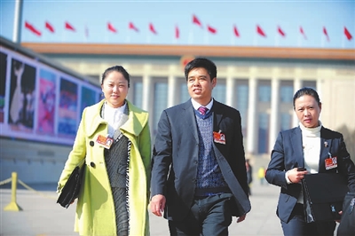 出席全体会议后,三位农民工代表朱雪芹(左)、康厚明(中)、胡小燕(右)满怀信心步出人民大会堂。