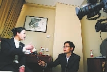 来自广东省的农民工代表胡小燕接受两家电视台的采访。她关注的是农民工子女的教育问题。 本报记者 杨登峰 摄
