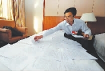 全国人大代表、山东临沂市人民医院院长尹传贵在整理自己的议案。他希望为解决看病难问题出份力。 本报记者 杨登峰 摄