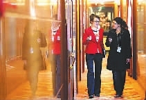 在甘肃代表团小组讨论会后,80后人大代表毕红珍向记者讲述她对于养老问题的调研情况。 本报记者 杨登峰 摄