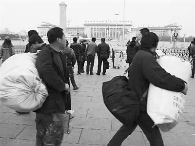 3月5日,十一届全国人大四次会议在北京人民大会堂开幕。早晨7点,两位刚下火车的河北籍农民工从天安门广场经过,今年的两会,民生仍是代表和委员热议的焦点。杨登峰 摄