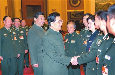 3月12日,中共中央总书记、国家主席、中央军委主席胡锦涛,出席十一届全国人大四次会议解放军代表团全体会议。中共中央政治局常委、国家副主席、中央军委副主席习近平出席会议。这是会议结束时,胡锦涛等军委领导同志会见来自基层和一线专业技术岗位的部分军队人大代表,并与他们进行亲切交谈。新华社记者 李刚 摄