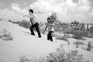 2009年8月,在内蒙古自治区鄂尔多斯,全国治沙英雄殷玉珍和自己的丈夫到沙漠中植树。他们25年的努力,让曾经荒无人烟的毛乌素沙漠有了7万多亩绿色。
