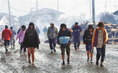 3月12日,在日本名取,当地居民从被地震摧毁的村庄中撤离。日本东北部地区11日下午发生里氏8.8级强烈地震,引发大规模海啸并造成重大损失。 新华社/路透
