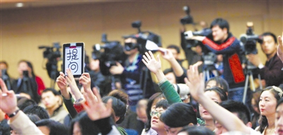 3月9日,在十一届全国人大四次会议举行的一场记者会上,来自广东新快报的一位记者高举着电子工具进行提问。 本报记者 杨登峰 摄