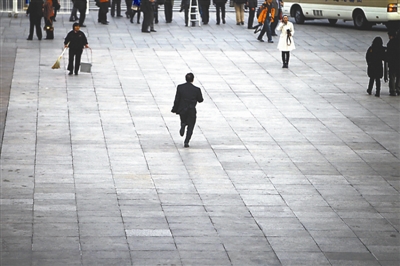 3月11日下午,第十一届全国人大四次会议全体会议结束后,一位代表在接受记者采访后,一路小跑赶往乘车点。本报记者 杨登峰 摄
