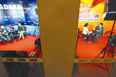两会期间,许多媒体在人民大会堂设立直播间,抢在第一时间就将两会的信息传播给社会。本报记者 杨登峰 摄
