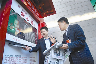 3月9日中午,两位农业界的委员把看过的旧报纸投放到驻地的“爱心屋”里。两会期间,中华慈善总会在驻地的部分宾馆设置了“爱心屋”,专门用于收集旧报纸,废纸变卖资金及募捐善款用于资助贫困家庭的先天性心脏病儿童。本报记者 张宪 摄