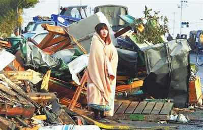 3月13日,在日本宫城县地震废墟前,一位女子裹着被子御寒。吉平 供图