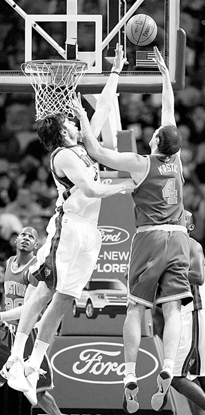 3月13日,在美国波士顿举行的美国职业篮球联赛(NBA)波士顿凯尔特人队与密尔沃基雄鹿队第三节比赛中,凯尔特人队前锋克尔斯蒂奇(右)面对雄鹿队中锋博古特(左)投篮。凯尔特人队以86:56获胜。
