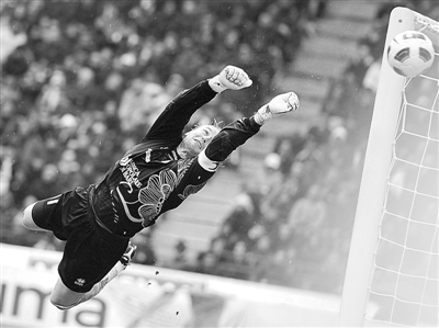 3月13日,在意大利米兰举行的意甲联赛AC米兰队对阵巴里队的比赛中,巴里队门将让·吉利特跳起救球。新华社/EPA欧新