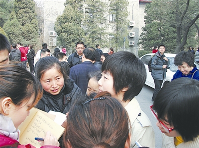 第一组进行面试的学生刚从偏门出来,大批家长立刻蜂拥而至,将这些出来的考生围住进行“现场采访”,询问面试的场景和题目。来自哈尔滨师大附中的刘同学俨然一个新闻发言人模样,面对各路家长媒体的提问侃侃而谈。据她介绍,老师很和蔼,题目也很开放。诸如“你对有人续写《红楼梦》此事如何评价?”“社会低水平收入人群的增加会带来什么样的问题?”……