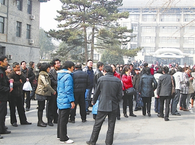 3月12日,家长 、老师们在北大教学楼门口等待面试的学生。
