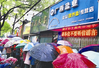 3月17日一大早,由于担心日本核辐射对周边海水产生影响,还没到上班开门时间,广西盐业公司专营店门口就排满了购盐的市民。到中午12点,还有300~500人在冒雨排长队购盐。南宁市建政路一超市里的盐架早已空空,还是不断有人来询问,超市只好贴出告示。买不到食盐的市民转而抢购酱油。骆文刚 摄