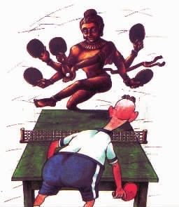 乒乓球选手遇到强将,人家的进攻、退防、推拉、削劈战术多变,闪转腾挪步步紧逼。他连连惊呼:我见到千手观音下凡啦!