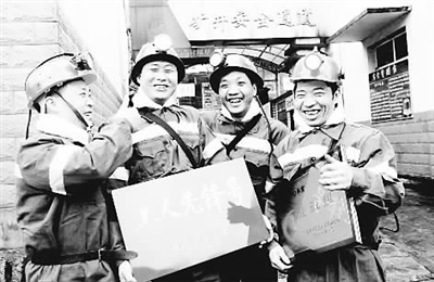 对重庆能源南桐矿业新田湾煤矿采煤队调修护班来说,3月15日非同寻常。到这天为止,他们本月中竟然是“六喜临门”:一喜:荣获重庆市工人先锋号;二喜:获得重庆能源百佳班组;三喜:班长张宗德和弟弟张宗伦、分别被公司评为劳模、矿标兵;四喜:副班长王良云被公司团委评为优秀青安岗员;五喜:荣获公司先进班组;六喜:人均涨工资400元并增加井下津贴。抱着先进牌匾,班长张宗德和工友们喜上眉梢, 大伙幸福指数明显提高。 曹永龙 摄