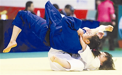 3月17日,煤矿体协队选手刘建华(深衣)和陕西队选手泽仁太在女子57公斤级第一轮比赛中角逐。最终刘建华获胜。当日,2011年全国女子柔道锦标赛在湖南邵阳开赛,来自全国31个省市、自治区以及新疆生产兵团、上海体育学院等45个代表队的365名运动员参加比赛,本次比赛于19日结束。新华社记者 李尕 摄