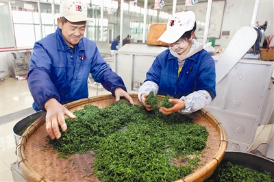 3月19日,崂山区王哥庄晓望村一茶厂内,工人在加工刚采摘的第一茬春茶。