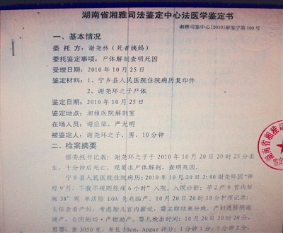 2010年11月17日,湖南省湘雅司法鉴定中心鉴定结论认为:“谢尧环之子死亡原因符合新生儿重度窒息特点。”