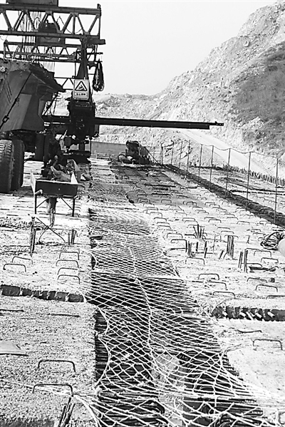 图为下章召大桥预制梁之间湿接缝用防护网防护后,施工人员不用担心在桥面上施工出现安全事故。据悉,中铁十一局四公司平阳高速公路项目部,一直把确保安全防护投入,不留任何安全隐患,作为一项硬件工作来抓。郑传海 摄