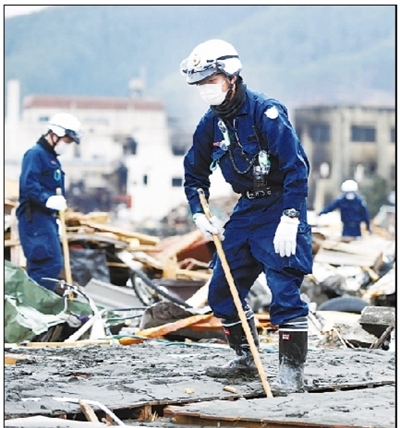 3月21日,在日本岩手县大槌町,救援人员正在紧张工作。