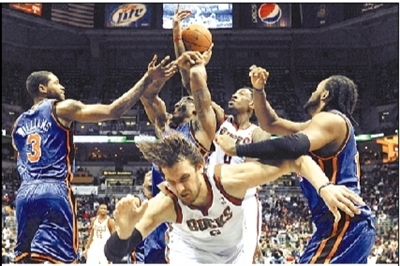 3月20日,在NBA联赛纽约尼克斯队对阵密尔沃基雄鹿队的比赛中,密尔沃基雄鹿队主场以100比95战胜纽约尼克斯队。新华社/EPA欧新