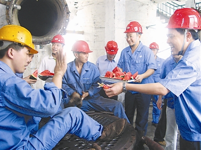 刘仲权 ( 右一 ) 为高温下员工送 “ 清凉 ”