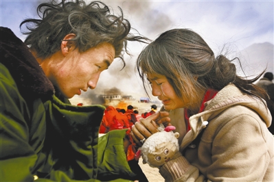 2010年4月17日,在青海结古镇扎西大通路西侧的山坡上,20岁的贡嘎正在安慰哭泣的妻子卓嘎,卓嘎的姨娘在4·14地震中遇难,按照当地习俗,卓嘎姨娘的遗体连同遇难者遗体一同火化。张宏伟 摄