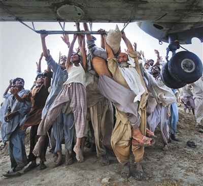 2010年8月7日,巴基斯坦旁遮普省,在特大洪灾中的受灾民众试图抓住分发救援食品的军方直升机。 阿德里斯·拉蒂夫摄