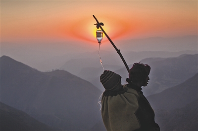 2010年1月4日,四川省美姑县黄茅埂一位妇女背着输液的儿子回家。随着新型农村合作医疗试点工作推进,更多的农民从中受益。赵培源 摄