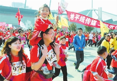 3月27日,河南郑州,一名小孩子骑在家长脖子上参加马拉松比赛。当日,中国郑开国际马拉松赛在郑州鸣枪开赛,来自20多个国家和地区的2.8万人参加比赛。王中举 摄