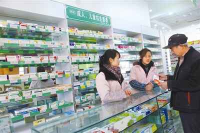 3月28日,四川眉山一位市民(右)在当地一家药店购买降价的抗生素药。