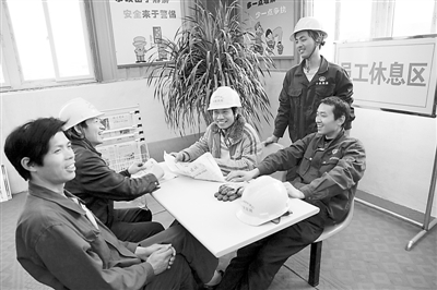 图为3月20日,中铁四局杭(州)长(沙)铁路客运专线浙江段项目经理部金东轨道板场的湖南籍农民工李中华和工友们工歇时间在休息区内看报、聊天。