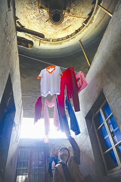3月29日,一位住户在晾晒衣服,过道里能够透进一些阳光。