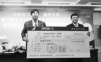 本报讯(记者陶映荃)3月23日,在清华大学100年校庆之际,中国南方航空集团公司与清华大学举行签约仪式,共同宣布深化南航高级管理人员的培训合作。未来五年,南航将继续选送约100名高级管理人员参加清华大学工商管理硕士(EMBA)班学习。同时,南航“十分”关爱基金向清华大学捐赠100万元人民币,再次资助100名品学兼优、家庭经济困难的清华学子完成学业。