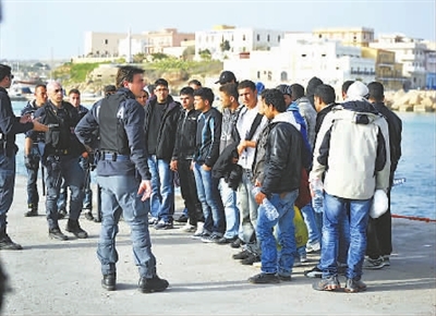 近几天来,由于不断有北非非法移民涌入意大利最南端的兰佩杜萨岛,造成岛上拥挤不堪。意大利准备派出6艘船只,于30日抵达兰佩杜萨全面转移北非移民。这6艘船只能容纳约1万人。图为警察正清点准备转移的北非移民。肖劼 供图