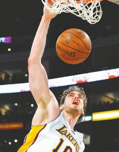 3月27日,在美国加利福尼亚州洛杉矶举行的美国职业篮球联赛NBA新奥尔良黄蜂队客场挑战洛杉矶湖人队的比赛中,湖人队的西班牙球员保·加索尔灌篮。最终,洛杉矶湖人主场以102:84大胜新奥尔良黄蜂。