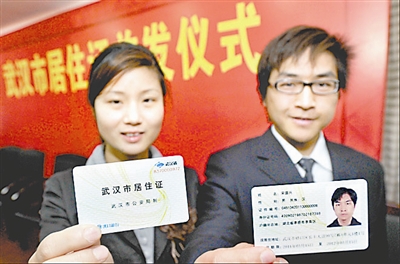 3月30日,在武汉市一家装饰公司当设计师的湖北孝感籍青年宋盛兴(右)和在一家服装厂工作的湖北仙桃籍青年刘舒展示刚刚领到的武汉市居住证。